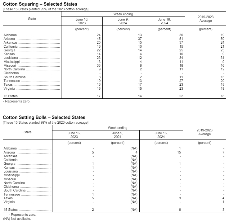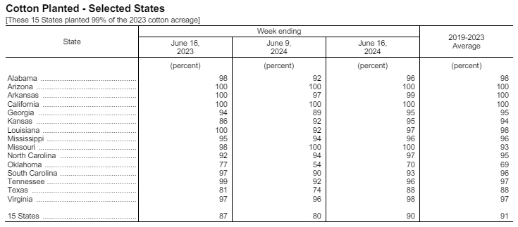 據(jù)美國(guó)農(nóng)業(yè)部網(wǎng)站6月17日消息,美國(guó)農(nóng)業(yè)部(USDA)在每周作物生長(zhǎng)報(bào)告中公布稱(chēng),截至2024年6月16日當(dāng)周,美棉種植率為90%,前周為80%,去年同期為87%,五年均值為91%。美棉現(xiàn)蕾率為22%,前周為14%,上年同期為17%,五年均值為18%。美棉結(jié)鈴率為6%,上年同期為2%,五年均值為3%。美棉優(yōu)良率為54%,前周為56%,上年同期為47%。