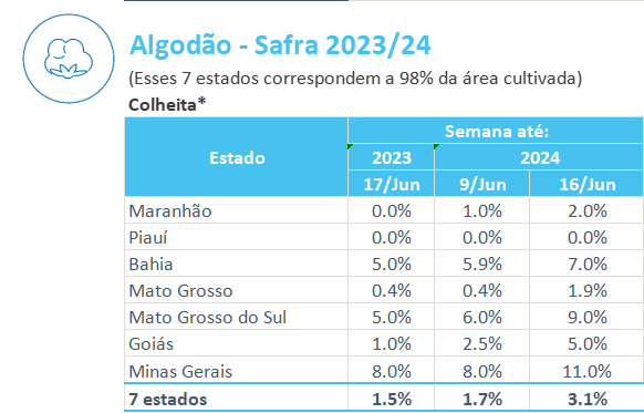 據(jù)巴西農(nóng)業(yè)部下屬的國家商品供應(yīng)公司CONAB,截至6月16日,巴西棉花收割率為3.1%,上周為1.7%,去年同期為1.5%。
