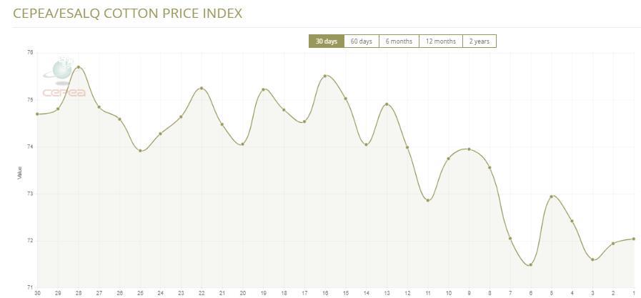據(jù)外電6月19日消息,6月19日巴西CEPEA/ESALQ棉花價(jià)格指數(shù)報(bào)每磅72.04美分,較前一日上漲0.14%。