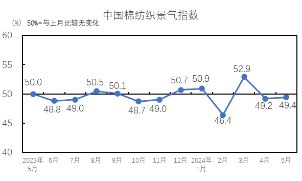 2024年5月,企業(yè)經(jīng)營指數(shù)為49.9%,低臨界點(diǎn),與4月持平。進(jìn)入5月,淡季行情逐步深入,企業(yè)銷量減少,營業(yè)收入進(jìn)一步降低。5月中旬棉花現(xiàn)貨價(jià)格出現(xiàn)反彈,至月底基本回到月初水平,企業(yè)成本壓力有所減緩,利潤總額有所好轉(zhuǎn)。從構(gòu)成企業(yè)經(jīng)營指數(shù)的分項(xiàng)指標(biāo)看,主營業(yè)務(wù)收入指數(shù)為49.1%,較4月下降0.2個(gè)百分點(diǎn);利潤總額指數(shù)為50.7%,較4月上升0,1個(gè)百分點(diǎn)。4月主營業(yè)務(wù)收入指數(shù)出現(xiàn)下降,體現(xiàn)出市場淡季行情深入的趨勢。