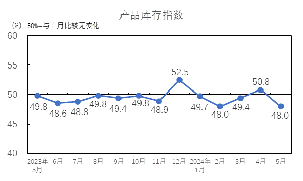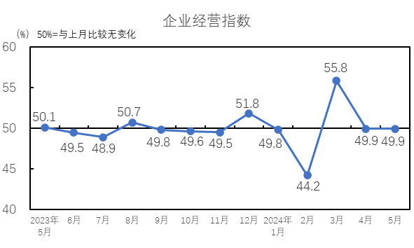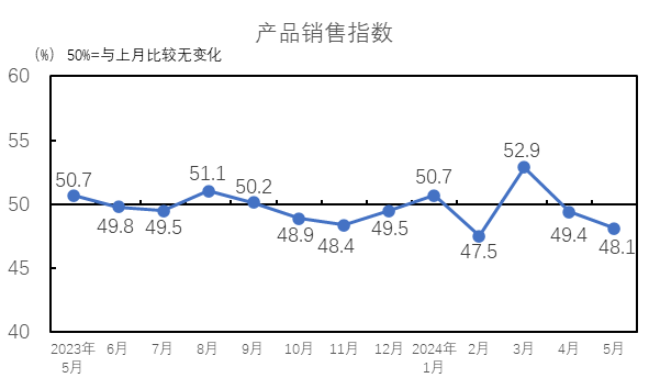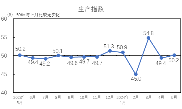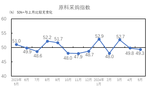 中國制造業(yè)采購經(jīng)理指數(shù)有所回落。國家統(tǒng)計(jì)局發(fā)布的2024年5月中國制造業(yè)采購經(jīng)理指數(shù)為49.5%,較4月下降0.9個(gè)百分點(diǎn)。受前期制造業(yè)增長較快形成較高基數(shù)和有效需求不足等因素影響,制造業(yè)景氣水平有所回落。