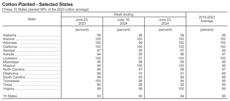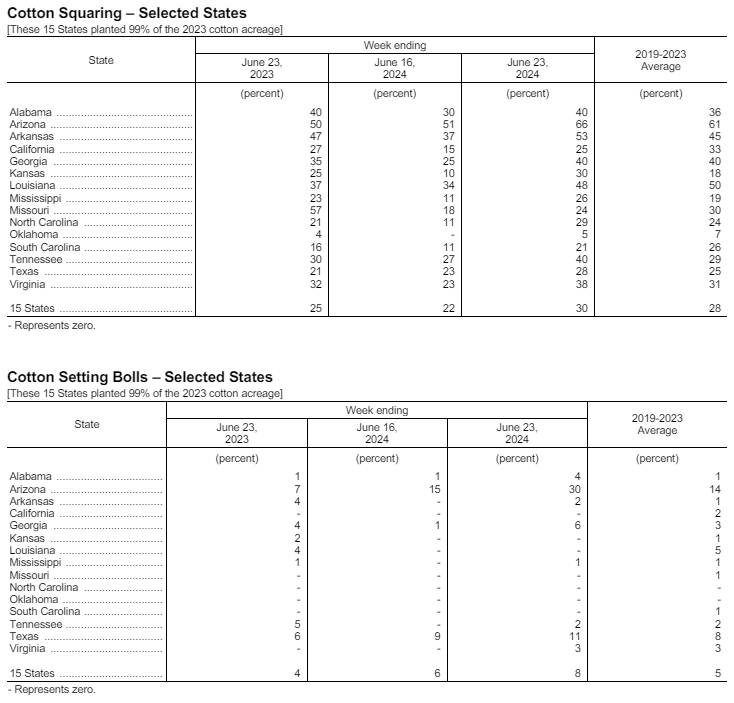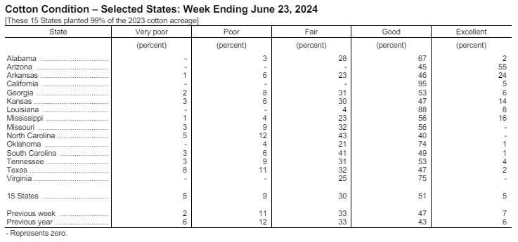 據(jù)美國農(nóng)業(yè)部網(wǎng)站6月24日消息,美國農(nóng)業(yè)部(USDA)在每周作物生長報告中公布稱,截至2024年6月23日當(dāng)周,美棉種植率為94%,前周為90%,去年同期為93%,五年均值為96%。美棉現(xiàn)蕾率為30%,前周為22%,上年同期為25%,五年均值為28%。美棉結(jié)鈴率為8%,前周為6%,上年同期為4%,五年均值為5%。美棉優(yōu)良率為56%,前周為54%,上年同期為49%。