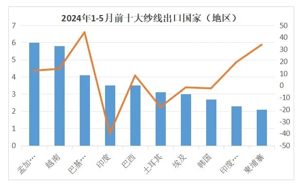 1-5月對(duì)孟出口紗線6.0億美元,同比增長(zhǎng)12.3%;5月單月對(duì)孟出口紗線1.3億美元,同比增長(zhǎng)38.9%。