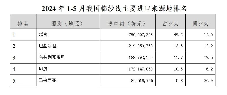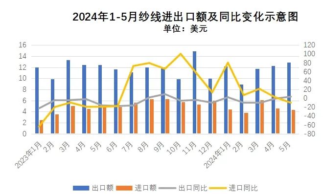 越南:1-5月我國(guó)對(duì)越南出口紗線5.8億美元,同比增長(zhǎng)13.7%。5月我國(guó)對(duì)越南出口紗線1.3億美元,同比增長(zhǎng)24.7%。