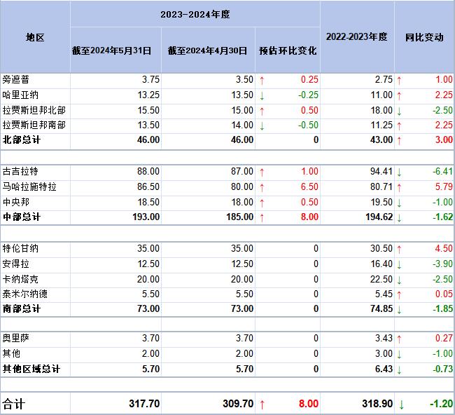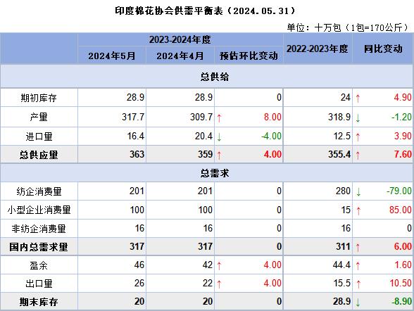 截至2024年5月底的棉花總供應(yīng)量估計(jì)為3630萬包,進(jìn)口164萬包,期初庫存289萬包。