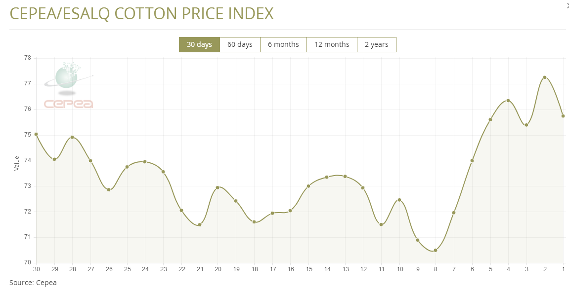 據(jù)外電7月10日消息,7月10日巴西CEPEA/ESALQ棉花價(jià)格指數(shù)報(bào)每磅75.74美分,較前一日下跌1.95%。