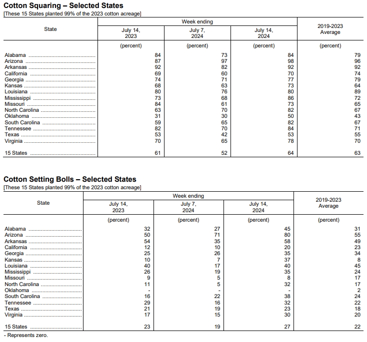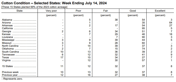 美國農(nóng)業(yè)部(USDA)在每周作物生長報告中公布稱,截至2024年7月14日當周,美棉現(xiàn)蕾率為64%,前周為52%,上年同期為61%,五年均值為63%。美棉結(jié)鈴率為27%,前周為19%,上年同期為23%,五年均值為22%。美棉優(yōu)良率為45%,前周為45%,上年同期為45%。