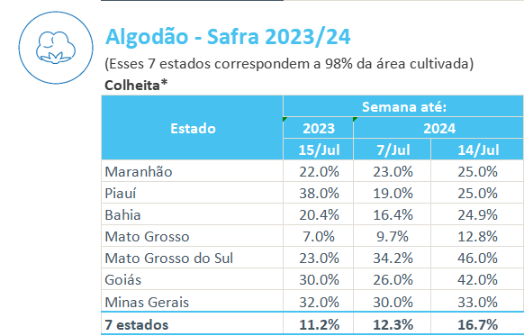 據(jù)巴西農(nóng)業(yè)部下屬的國(guó)家商品供應(yīng)公司CONAB,截至7月14日,巴西棉花收割率為16.7%,上周為12.3%,去年同期為11.2%。