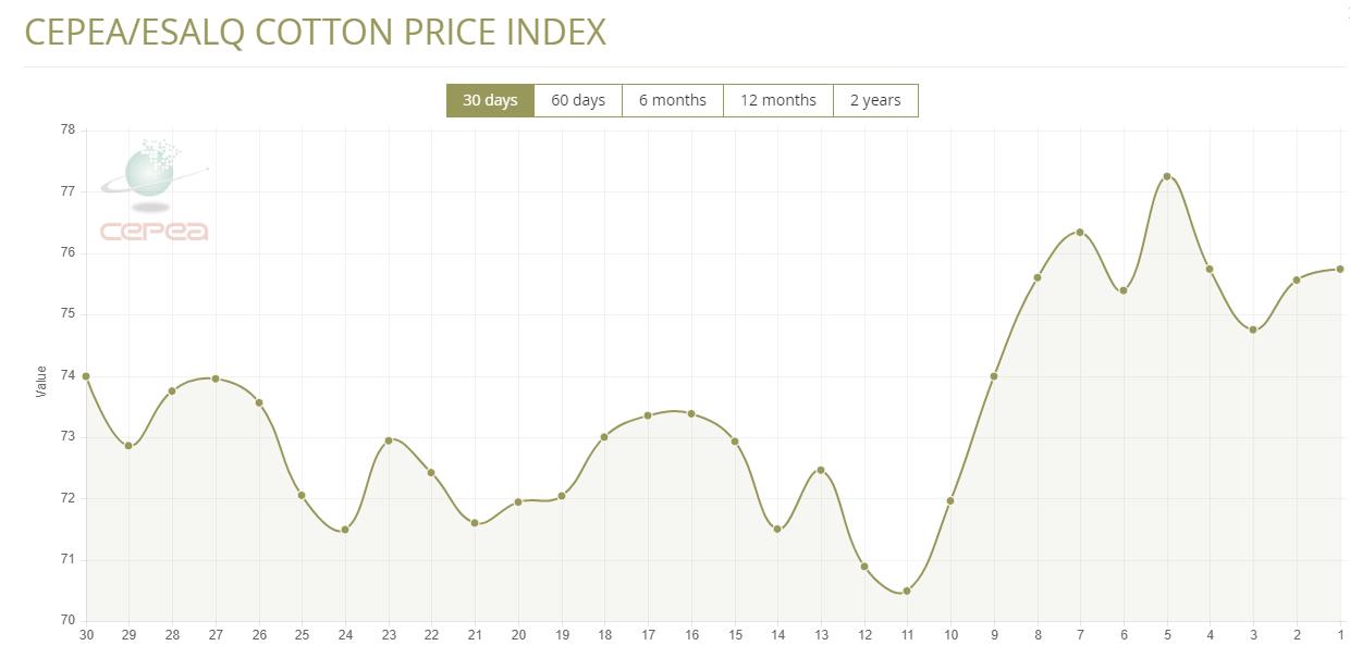 據(jù)外電7月15日消息,7月15日巴西CEPEA/ESALQ棉花價格指數(shù)報每磅75.74美分,較前一日上漲0.24%。
