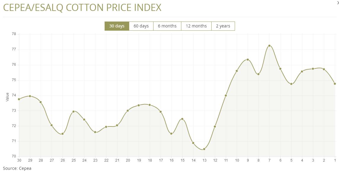 據(jù)外電7月17日消息,7月17日巴西CEPEA/ESALQ棉花價(jià)格指數(shù)報(bào)每磅74.76美分,較前一日下跌1.25%。