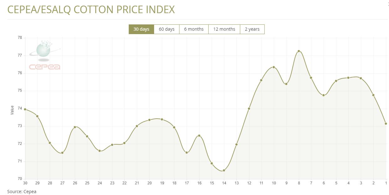 據(jù)外電7月18日消息,7月18日巴西CEPEA/ESALQ棉花價(jià)格指數(shù)報(bào)每磅73.14美分,較前一日下跌2.17%。