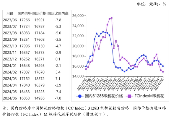(七)預(yù)計(jì)國(guó)內(nèi)外棉價(jià)低位震蕩。國(guó)內(nèi)市場(chǎng):國(guó)家棉花市場(chǎng)監(jiān)測(cè)數(shù)據(jù)顯示,截至6月20日,全國(guó)銷售率為82.4%,同比下降13.3個(gè)百分點(diǎn),待售皮棉總量仍接近100萬(wàn)噸。內(nèi)外棉價(jià)差持續(xù)擴(kuò)大,棉花進(jìn)口保持高位,2023/24年度棉花進(jìn)口量達(dá)274.2萬(wàn)噸,較上年度增1.6倍。全國(guó)棉花生長(zhǎng)進(jìn)入盛蕾期,氣候條件總體適宜,棉花長(zhǎng)勢(shì)良好。下游紡織市場(chǎng)處傳統(tǒng)淡季,紡織廠產(chǎn)成品庫(kù)存較高,用棉需求較弱,據(jù)國(guó)家棉花市場(chǎng)監(jiān)測(cè)系統(tǒng)調(diào)查,6月初被抽樣調(diào)查企業(yè)開(kāi)機(jī)率71.4%,環(huán)比下降7.2個(gè)百分點(diǎn)。國(guó)內(nèi)棉花市場(chǎng)維持供強(qiáng)需弱態(tài)勢(shì),價(jià)格預(yù)計(jì)低位震蕩。國(guó)際市場(chǎng):北半球各棉花主產(chǎn)國(guó)新棉播種基本結(jié)束,植棉面積較上年度增幅明顯。全球經(jīng)濟(jì)延續(xù)溫和復(fù)蘇趨勢(shì),棉花消費(fèi)總體偏弱。據(jù)國(guó)際紡織制造商聯(lián)合會(huì)(ITMF)發(fā)布的5月份全球紡織調(diào)查顯示,紡織經(jīng)營(yíng)預(yù)期已持續(xù)1年未見(jiàn)改善,紡織經(jīng)營(yíng)環(huán)境持續(xù)不佳迫使企業(yè)虧本生產(chǎn)或者降低開(kāi)機(jī)率,預(yù)計(jì)短期國(guó)際棉價(jià)偏弱震蕩。