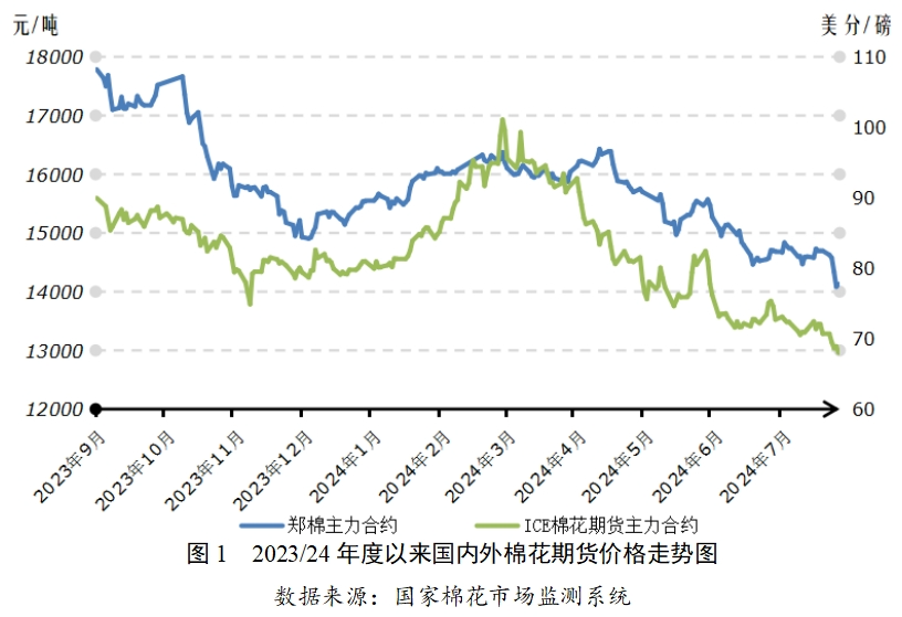 7月以來,國內(nèi)外棉紡織市場仍處淡季,新增訂單有限,各棉花主產(chǎn)國天氣未出現(xiàn)大的變化,全球棉花增產(chǎn)預期沒有改變,國內(nèi)外棉價震蕩下行,7月26日ICE棉花期貨主力合約結(jié)算價67.99美分/磅,較月初下跌5.11美分/磅,跌幅7%;代表進口棉中國主港到岸均價的國際棉花指數(shù)(M)77.07美分/磅,較月初下跌5美分/磅,折人民幣進口成本13310元/噸(1%關(guān)稅,不含港雜費),較月初下跌864元/噸,跌幅6.1%。鄭州商品交易所棉花期貨主力合約結(jié)算價14130元/噸,較月初下跌535元/噸,跌幅3.6%;代表內(nèi)地標準級皮棉市場價格的國家棉花價格B指數(shù)15421元/噸,環(huán)比下跌350元/噸,跌幅2.2%。