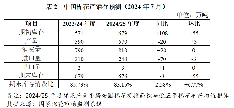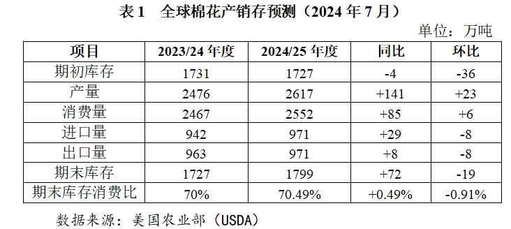 北半球棉花春播以來,各主產(chǎn)區(qū)棉花播種和生長較順利,6月末,美國和中國發(fā)布的2024年棉花實播面積均超過前期意向植棉面積調(diào)查,其中據(jù)美國農(nóng)業(yè)部統(tǒng)計,美國棉花實播面積1170萬英畝,較前期意向種植面積增加102.7萬英畝,增幅9.6%;據(jù)國家棉花市場監(jiān)測系統(tǒng)統(tǒng)計,中國棉花實播面積4083.3萬畝,較前期意向種植面積增加33.4萬畝,增幅0.8%。美國農(nóng)業(yè)部7月公布的全球棉花供需預測報告顯示,2024/25年度全球棉花產(chǎn)量2617萬噸,環(huán)比調(diào)增23萬噸;棉花消費量2552萬噸,環(huán)比調(diào)增6萬噸;產(chǎn)需過剩量65萬噸,環(huán)比調(diào)增17萬噸(表1)。