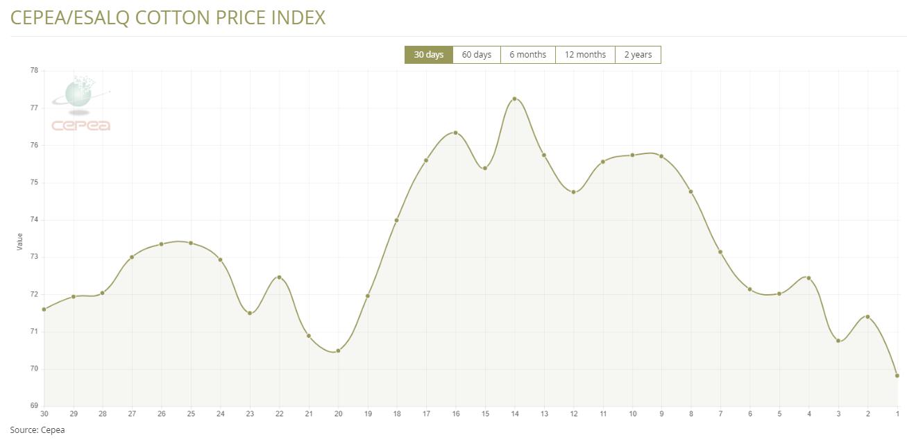 據(jù)外電7月26日消息,7月26日巴西CEPEA/ESALQ棉花價(jià)格指數(shù)報(bào)每磅69.82美分,較前一日下滑2.21%。