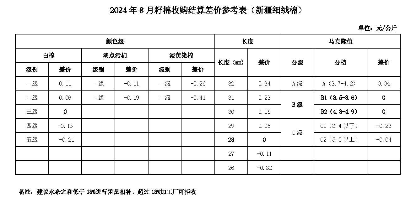 依據(jù)中國棉花協(xié)會發(fā)布的2024年8月《鋸齒加工細(xì)絨棉質(zhì)量差價表》和中國棉花預(yù)警系統(tǒng)2023年9月-2024年1月新疆籽棉收購平均衣分率數(shù)據(jù),折算得出籽棉收購差價,現(xiàn)正式發(fā)布2024年8月《籽棉收購結(jié)算差價參考表(新疆細(xì)絨棉)》(單位:元/公斤),為新疆地區(qū)籽棉收購工作提供參考。