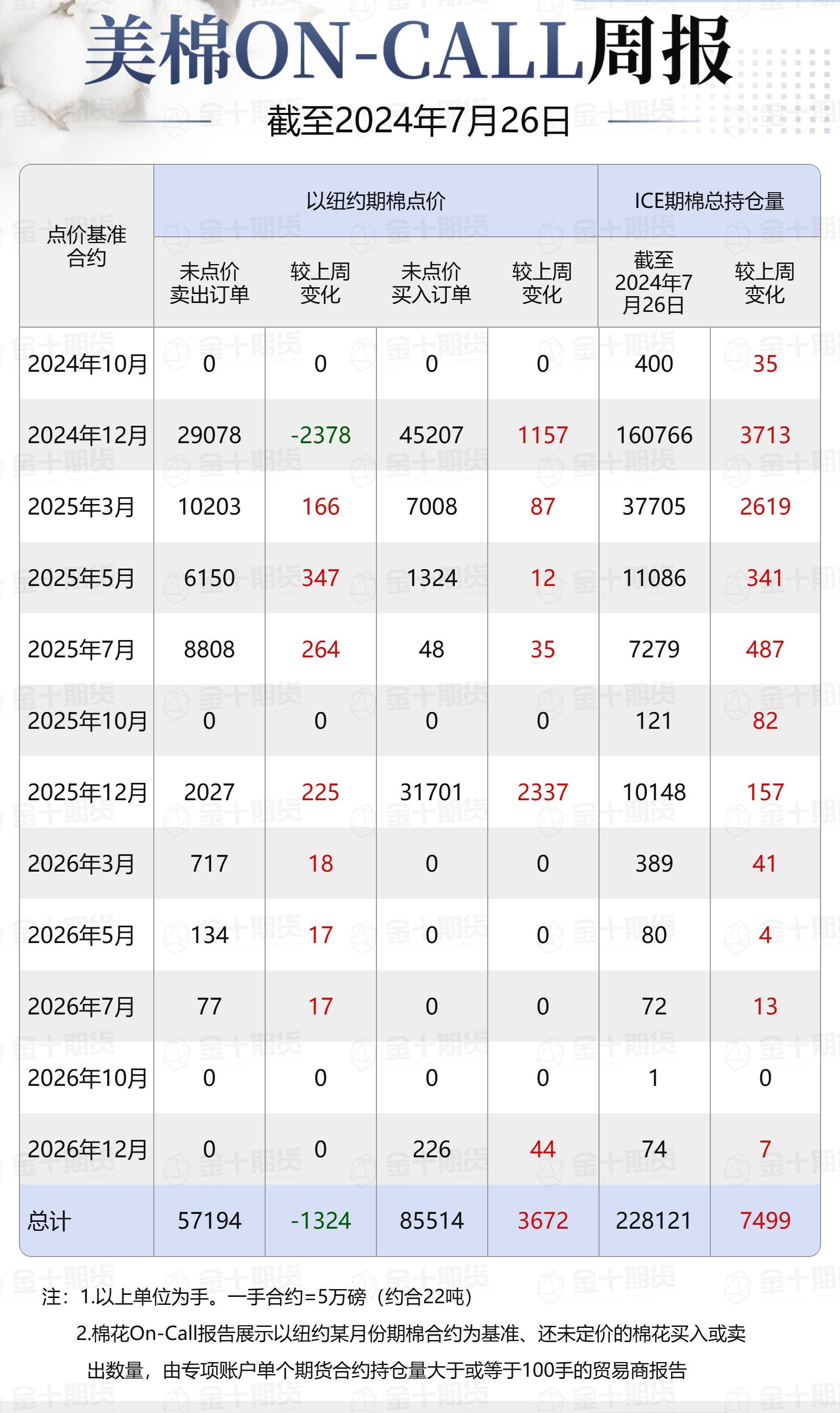 據(jù)美國商品期貨交易委員會(huì)(CFTC)最新數(shù)據(jù),截至7月26日,①美棉On-Call未點(diǎn)價(jià)賣出訂單57194手,環(huán)比減少1324手;未點(diǎn)價(jià)買入訂單85514手,環(huán)比增加3672手;②ICE期棉2410合約上賣方未點(diǎn)價(jià)合約為0手,環(huán)比增加0手;③ICE期棉2412合約上賣方未點(diǎn)價(jià)合約為29078手,環(huán)比減少2378手;④ICE期棉2503合約上賣方未點(diǎn)價(jià)合約為10203手,環(huán)比增加166手;⑤ICE期棉2505合約上賣方未點(diǎn)價(jià)合約為6150手,環(huán)比增加347手;⑥ICE期棉2507合約上賣方未點(diǎn)價(jià)合約為8808手,環(huán)比增加264手;⑦ICE棉花期貨盤面2024/25年度(8月至次年7月)的On-Call合約未點(diǎn)價(jià)賣出訂單為54239手,環(huán)比減少1601手。