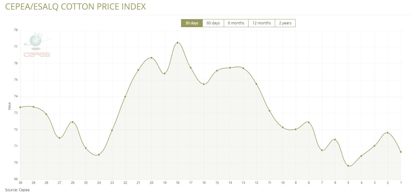 據(jù)外電8月1日消息,8月1日巴西CEPEA/ESALQ棉花價(jià)格指數(shù)報(bào)每磅70.66美分,較前一日下跌1.60%。