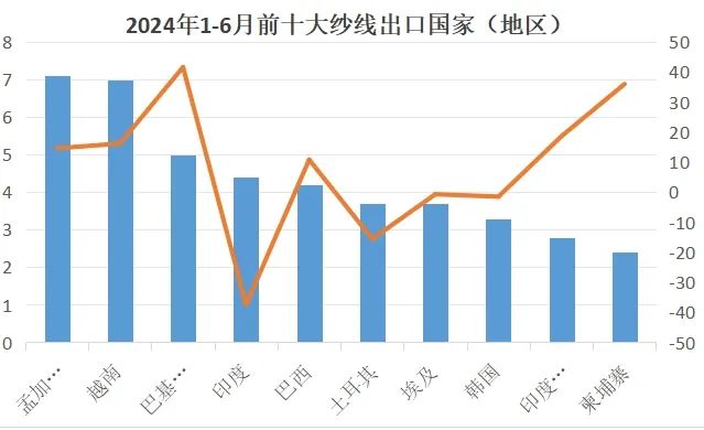 1-6月對印出口紗線4.4億美元,同比下降37.5%;6月對印出口紗線0.9億美元,同比下降24.4%。