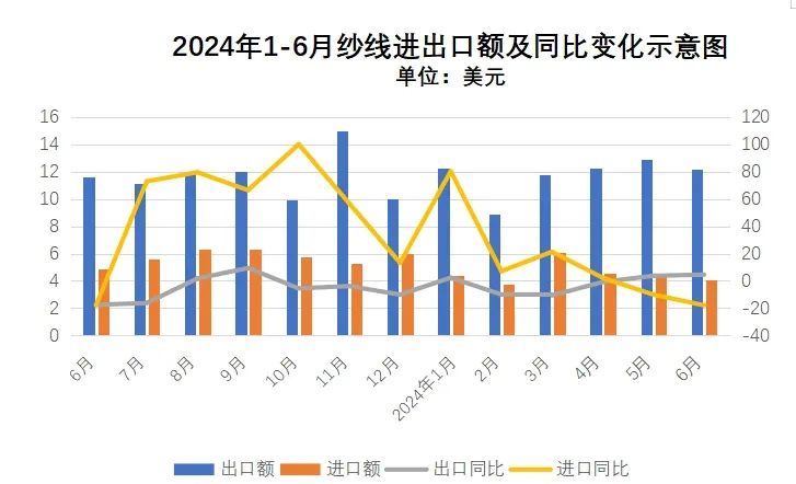 紗線進口1-6月累計增長,6月單月下降幅度擴大