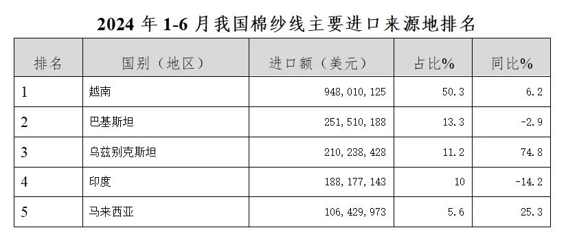 從進口來源看,進口棉紗前5大來源地全部來自亞洲地區(qū),前五大來源地合計占比90%。2024年1-6月我國自棉紗前五大來源地除印度外均增長,自越南進口棉紗線37.4萬噸,同比增長11.1%,占棉紗線進口總量48.2%,進口金額達9.5億,同比增6.2%,占進口總額的50.3%。我國自烏茲別克斯坦、馬來西亞進口棉紗線增長74.8%、25.3%,自巴基斯坦、印度進口棉紗線下降2.9%、14.2%。
