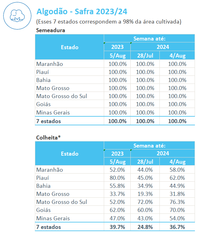 據(jù)巴西農(nóng)業(yè)部下屬的國(guó)家商品供應(yīng)公司CONAB,截至8月4日,巴西棉花收割率為36.7%,上周為24.8%,去年同期為39.7%。
