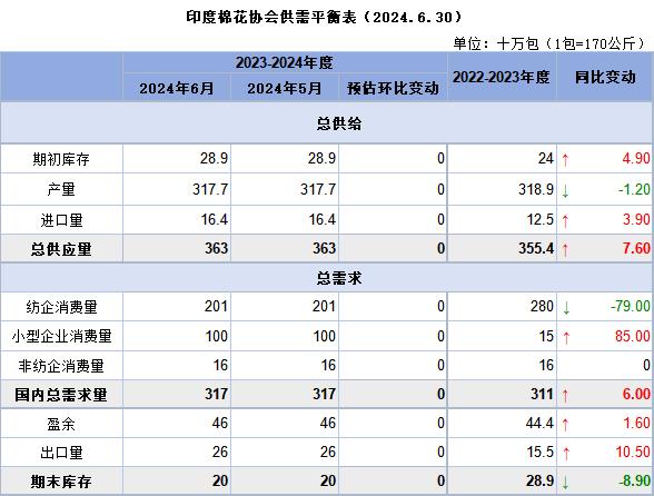 截至2024年5月底的棉花總供應(yīng)量估計(jì)為3630萬包,其進(jìn)口164萬包,期初庫存289萬包。