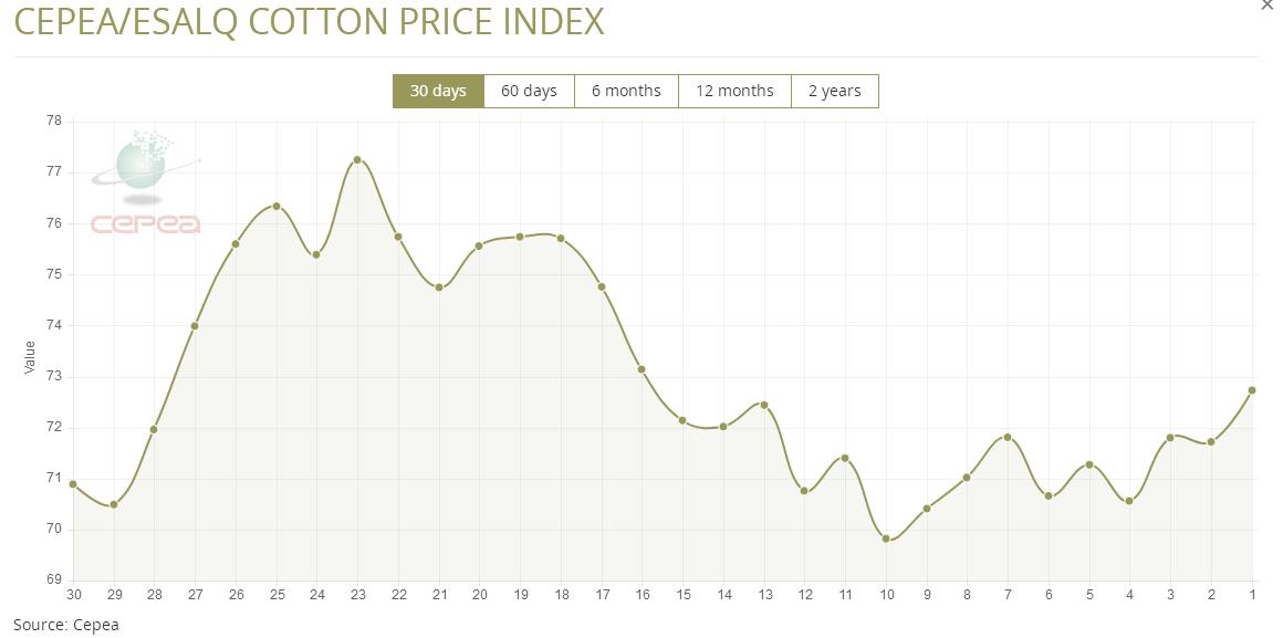 據(jù)外電8月8日消息,8月8日巴西CEPEA/ESALQ棉花價(jià)格指數(shù)報(bào)每磅72.73美分,較前一日上漲1.41%。