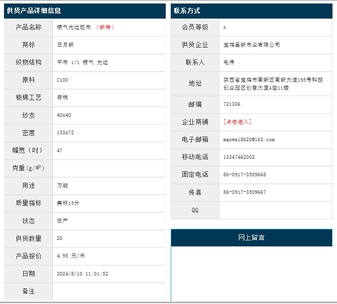 8月10日,寶雞昌新布業(yè)有限公司純棉平布C100 40x40 133x72 47" 1/1 噴氣 光邊,報價為4.95元/米,實(shí)際成交價以協(xié)商為準(zhǔn)。[點(diǎn)擊查看詳情]