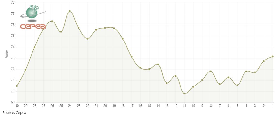 據(jù)外電8月9日消息,8月9日巴西CEPEA/ESALQ棉花價(jià)格指數(shù)報(bào)每磅73.16美分,較前一日上漲0.59%。