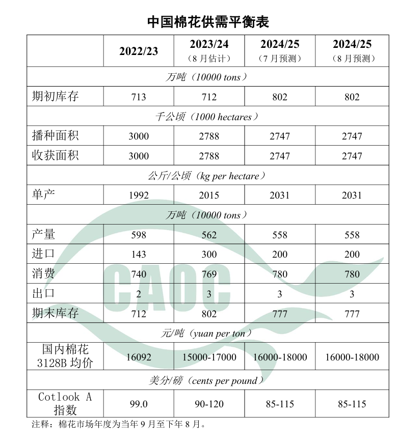 本月對中國棉花供需形勢預(yù)測與上月保持一致。目前大部棉花處開花結(jié)鈴期至裂鈴?fù)滦跗凇P陆迏^(qū)綜合氣象條件適宜,棉花長勢總體好于上年。當(dāng)前棉花供給較為充裕,隨著棉紡織市場“金九銀十”開始備貨,棉花需求有望逐步回升。全球棉花增產(chǎn)預(yù)期較強(qiáng),需求存在較大不確定性,國際棉價(jià)維持低位震蕩。后期需關(guān)注天氣對各主產(chǎn)國棉花產(chǎn)量的影響。
