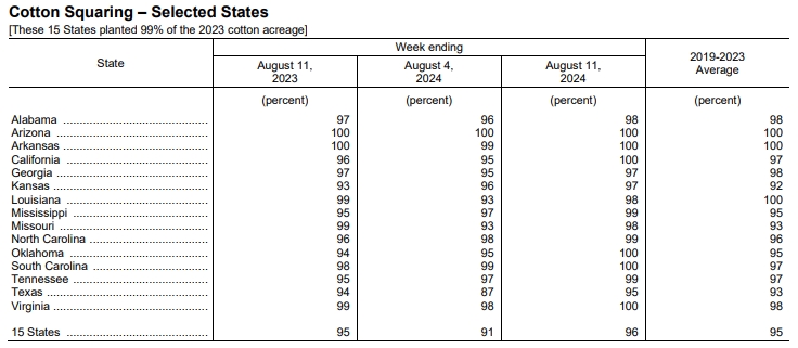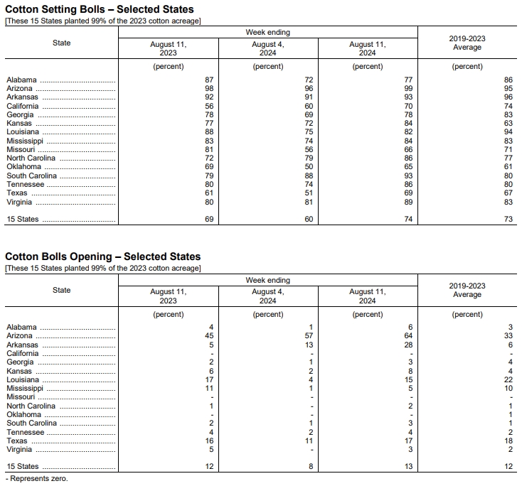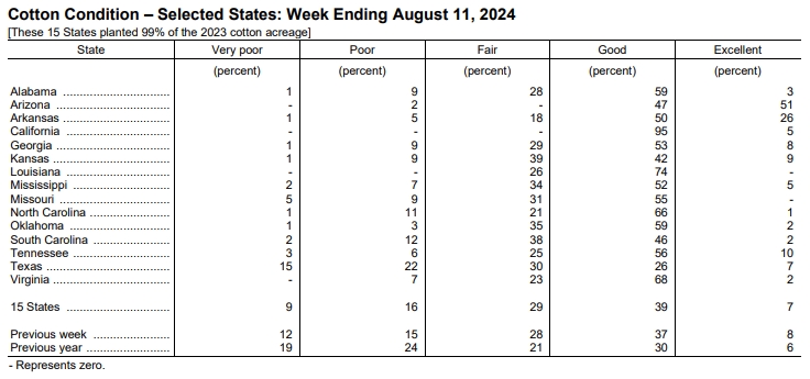 美國農(nóng)業(yè)部(USDA)在每周作物生長報告中公布稱,截至2024年8月11日當周,美棉現(xiàn)蕾率為96%,前周為91%,上年同期為95%,五年均值為95%。美棉結(jié)鈴率為74%,前周為60%,上年同期為69%,五年均值為73%。美棉盛鈴率為13%,前周為8%,上年同期為12%,五年均值為12%。美棉優(yōu)良率為46%,前周為45%,上年同期為36%。
