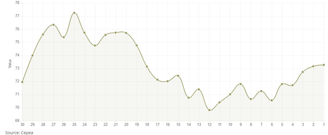 據(jù)外電8月12日消息,8月12日巴西CEPEA/ESALQ棉花價(jià)格指數(shù)報(bào)每磅73.27美分,較前一日上漲0.15%。