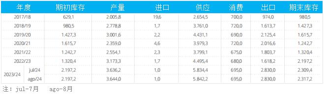 2023/24年度巴西棉花單產預估為1874千克/公頃,同比減少1.7%,2022/23年度為1907千克/公頃。