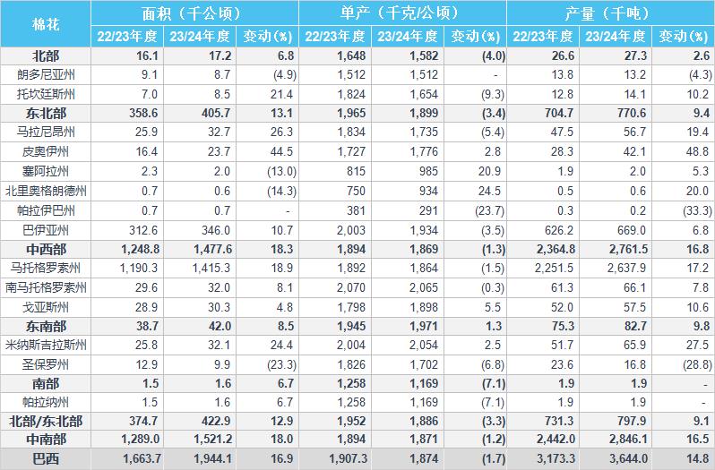 2023/24年度巴西棉花種植面積預估為194.41萬公頃,同比增加16.9%,2022/23年度為166.37萬公頃。