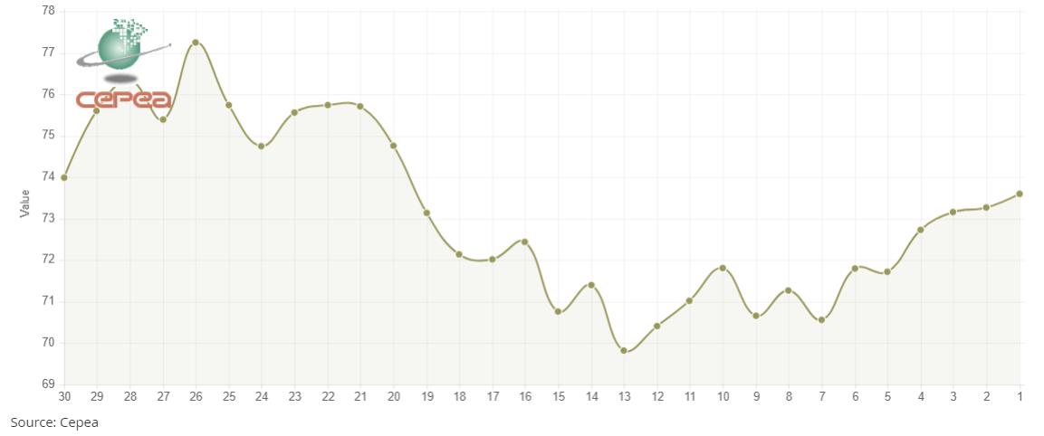 據(jù)外電8月13日消息,8月13日巴西CEPEA/ESALQ棉花價格指數(shù)報每磅73.60美分,較前一日上漲0.45%。