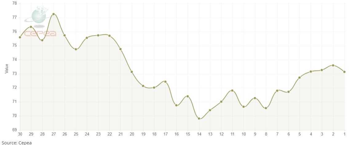 據(jù)外電8月14日消息,8月14日巴西CEPEA/ESALQ棉花價(jià)格指數(shù)報(bào)每磅73.14美分,較前一日下跌0.62%。