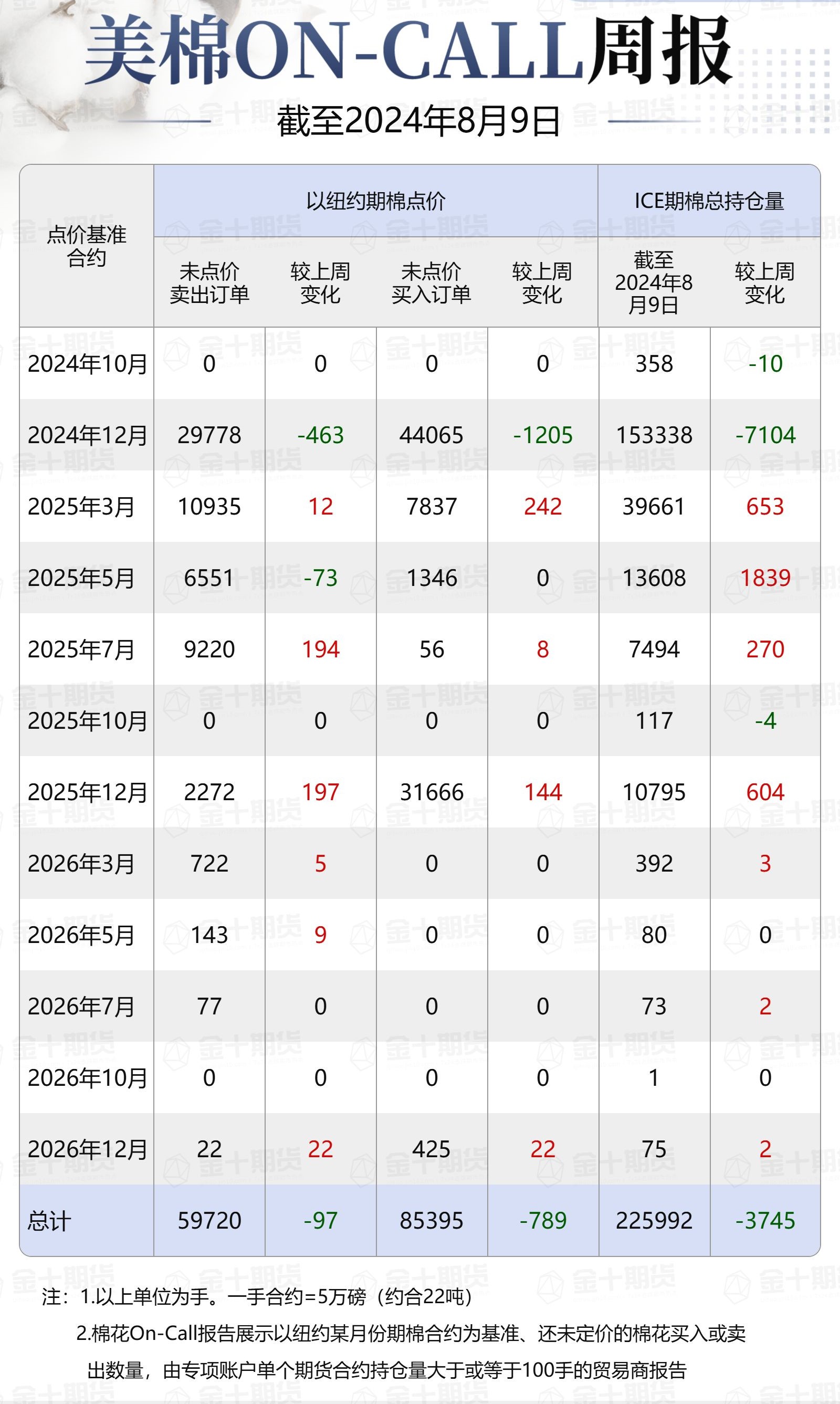 據(jù)美國商品期貨交易委員會(CFTC)最新數(shù)據(jù),截至8月9日,①美棉On-Call未點價賣出訂單59720手,環(huán)比減少97手;未點價買入訂單85395手,環(huán)比減少789手;②ICE期棉2410合約上賣方未點價合約為0手,較此前一周增加0手;③ICE期棉2412合約上賣方未點價合約為29778手,較此前一周減少463手;④ICE期棉2503合約上賣方未點價合約為10935手,較此前一周增加12手;⑤ICE期棉2505合約上賣方未點價合約為6551手,較此前一周減少73手;⑥ICE期棉2507合約上賣方未點價合約為9220手,較此前一周增加194手;⑦ICE棉花期貨盤面2024/25年度(8月至次年7月)的On-Call合約未點價賣出訂單為56484手,環(huán)比減少330手。