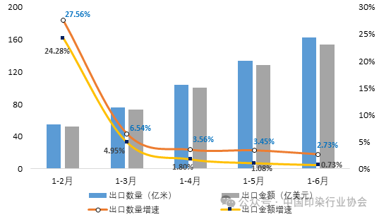 據(jù)中國(guó)海關(guān)統(tǒng)計(jì)數(shù)據(jù),2024年1-6月我國(guó)印染八大類產(chǎn)品出口數(shù)量162.10億米,同比增長(zhǎng)2.73%,增速較1季度回落3.81個(gè)百分點(diǎn);出口金額153.95億美元,同比增長(zhǎng)0.73%,增速較1季度回落4.22個(gè)百分點(diǎn);出口平均單價(jià)0.95美元/米,同比降低1.95%,降幅較1季度擴(kuò)大0.46個(gè)百分點(diǎn)。2024年上半年主要發(fā)達(dá)國(guó)家通脹壓力逐步緩解,全球經(jīng)濟(jì)溫和復(fù)蘇,國(guó)際品牌商進(jìn)入補(bǔ)庫(kù)存周期,越南、孟加拉等國(guó)對(duì)我國(guó)印染面料的需求增加,我國(guó)印染八大類產(chǎn)品出口規(guī)模在上年同期較高基數(shù)的基礎(chǔ)上實(shí)現(xiàn)小幅增長(zhǎng),但當(dāng)前外需增勢(shì)并不穩(wěn)固,印染產(chǎn)品出口市場(chǎng)競(jìng)爭(zhēng)加劇,出口平均單價(jià)仍呈下降態(tài)勢(shì)。在發(fā)達(dá)國(guó)家消費(fèi)趨于走弱、全球制造業(yè)景氣下行、基數(shù)走高等因素影響下,我國(guó)印染八大類產(chǎn)品出口增速逐月降低。