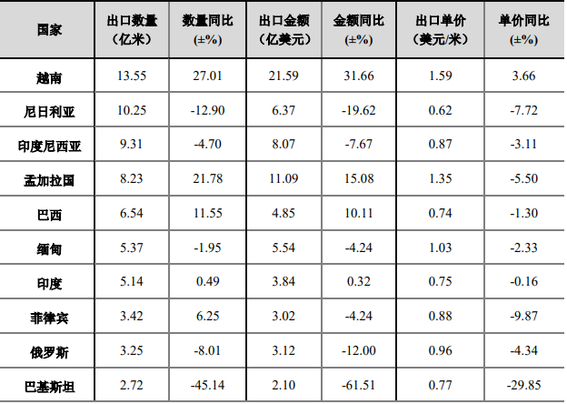 1-6月我國(guó)印染八大類產(chǎn)品對(duì)出口規(guī)模排名前十的國(guó)家出口數(shù)量達(dá)67.79億米,占出口總量的41.82%,出口市場(chǎng)集中度相對(duì)較高。其中對(duì)越南、孟加拉國(guó)、巴西的出口數(shù)量和出口金額均實(shí)現(xiàn)2位數(shù)增長(zhǎng),越南是前十國(guó)家中唯一一個(gè)出口平均單價(jià)上漲的國(guó)家。對(duì)尼日利亞、印度尼西亞、緬甸、俄羅斯、巴基斯坦出口呈不同程度下降,其中對(duì)巴基斯坦出口下滑最為明顯,出口數(shù)量和出口金額分別下滑45.14%和61.51%。