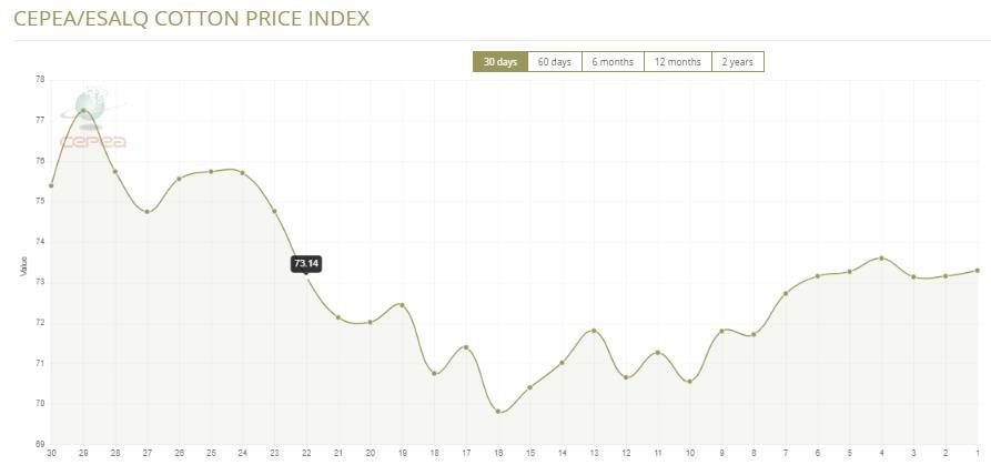 據(jù)外電8月16日消息,8月16日巴西CEPEA/ESALQ棉花價(jià)格指數(shù)報(bào)每磅73.30美分,較前一日上漲0.19%。