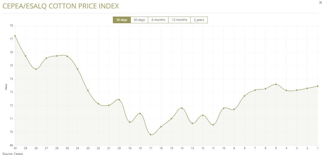 據(jù)外電8月19日消息,8月19日巴西CEPEA/ESALQ棉花價(jià)格指數(shù)報(bào)每磅73.46美分,較前一日上漲0.22%。