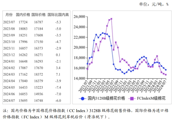 (一)國內(nèi)棉價(jià)繼續(xù)下跌。當(dāng)前,全國棉花大部處花齡期,其中新疆棉區(qū)氣候適宜,棉花長勢好于去年;內(nèi)地不利天氣較多,棉花長勢差于去年。本月,少量秋冬季訂單下達(dá),需求略有增加,棉花庫存逐步消化,企業(yè)開機(jī)率略有回升,但整體仍處消費(fèi)淡季,價(jià)格偏弱運(yùn)行。據(jù)國家棉花市場監(jiān)測系統(tǒng)抽樣調(diào)查,截至7月初,被抽樣調(diào)查企業(yè)棉花平均庫存34.3天,環(huán)比減少1.6天,同比增加9.6天;開機(jī)率74.4%,環(huán)比上升3.1個(gè)百分點(diǎn),同比下降13.3個(gè)百分點(diǎn)。7月,國內(nèi)3128B級棉花月均價(jià)每噸15695元,環(huán)比跌2.2%,同比跌11.4%。鄭棉期貨主力合約(CF409)月結(jié)算價(jià)每噸14130元,環(huán)比跌3.9%,同比跌17.9%。