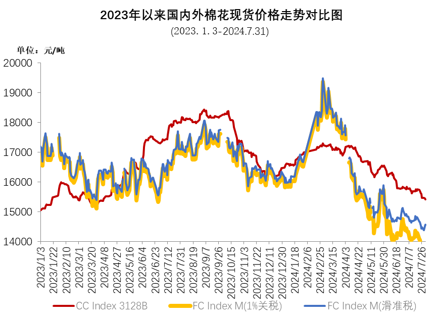 7月,國內(nèi)棉市供應(yīng)仍偏寬松,紡織下游需求延續(xù)平淡態(tài)勢,企業(yè)產(chǎn)能縮減,開機率低位運行,成品棉紗銷售價格小幅回落,銷售利潤減少,紡織廠為防范風(fēng)險,皮棉原料采購謹慎為主,中國棉花價格指數(shù)持續(xù)下跌,月末跌至15420元/噸,再創(chuàng)本年度新低。同期,美國經(jīng)濟衰退預(yù)期增強,市場避險情緒增加,外圍市場普遍下跌,疊加USDA月報上調(diào)新年度產(chǎn)量等因素影響,國際棉價震蕩走低,國際價格跌幅大于國內(nèi),內(nèi)外棉現(xiàn)貨價差有所擴大。