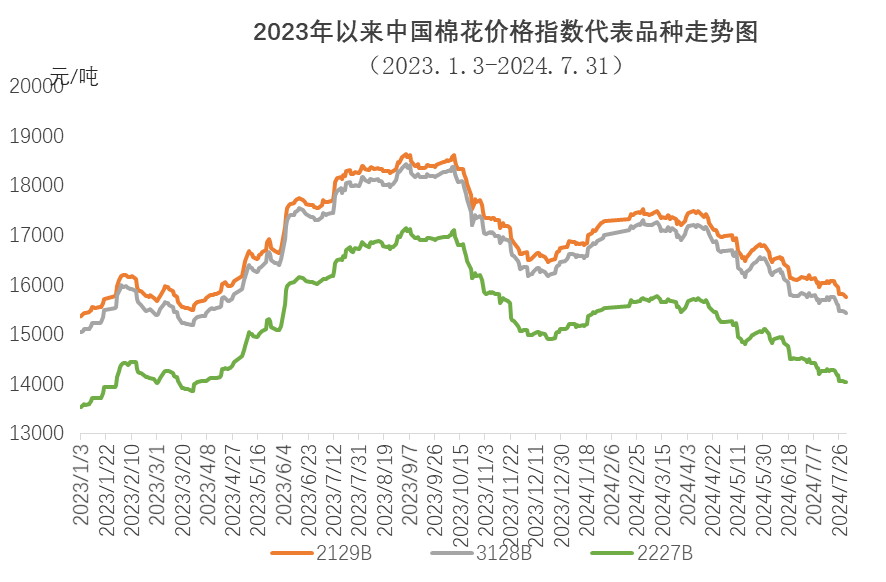 7月,中國棉花價格指數(shù)(CCIndex3128B)延續(xù)上月跌勢,7月31日最低跌至15420元/噸,為本年度以來新低。月內(nèi)下游訂單持續(xù)低迷,紡企銷售不暢,皮棉原料采購剛需為主。中國棉花價格指數(shù)(CCIndex3128B)月均價15673元/噸,環(huán)比下跌355元,同比下跌2083元。