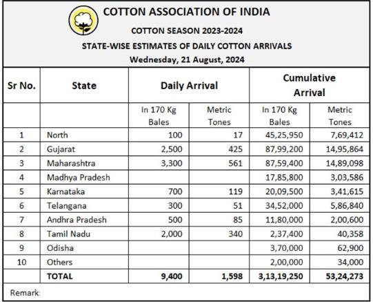 據(jù)外電8月21日消息,印度棉花協(xié)會(CAI)公布,8月21日印度棉花到貨量預(yù)估為9400包(每包170公斤)或1598噸。