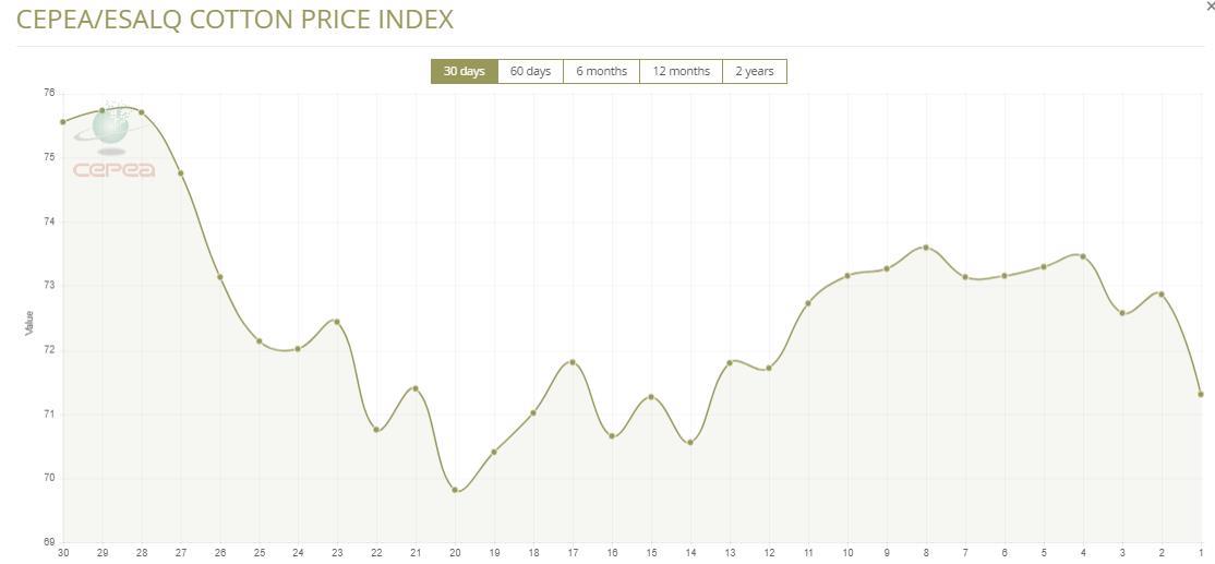 據(jù)外電8月22日消息,8月22日巴西CEPEA/ESALQ棉花價(jià)格指數(shù)報(bào)每磅71.31美分,較前一日下滑2.14%。
