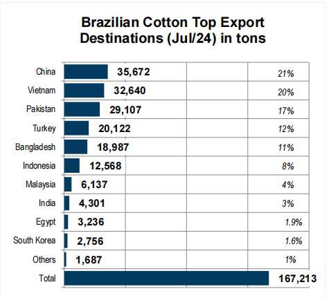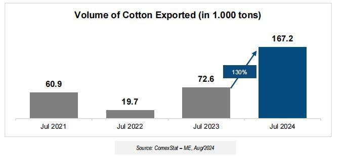 報(bào)告顯示,7月巴西出口棉花167200噸,出口收入達(dá)到3.10億美元。出口銷售數(shù)據(jù)較2023年7月跳增130%,較2024年6月增加4%。