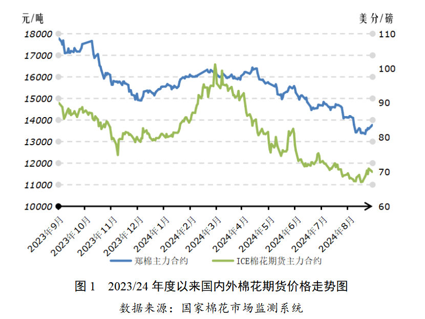 8月以來,美國制造業(yè)持續(xù)走弱,失業(yè)率上升,疊加日本宣布加息,引發(fā)全球股市及大宗商品市場普遍大跌。同時(shí),新棉增產(chǎn)預(yù)期漸強(qiáng),下游需求偏弱。在外圍市場和棉市基本面雙重利空因素影響下,國內(nèi)外棉價(jià)不斷下挫,ICE棉花期貨主力合約最低跌至66.26美分/磅,鄭棉主力合約價(jià)格最低跌至13200元/噸。隨后在美國農(nóng)業(yè)部大幅調(diào)減全球棉花產(chǎn)量預(yù)期,美聯(lián)儲(chǔ)降息預(yù)期升溫帶動(dòng)宏觀情緒好轉(zhuǎn)的驅(qū)動(dòng)下有所反彈。截至8月27日,ICE棉花期貨主力合約結(jié)算價(jià)69.98美分/磅,較月初上漲1.90美分/磅,漲幅2.8%;代表進(jìn)口棉中國主港到岸均價(jià)的國際棉花指數(shù)(M)78.62美分/磅,較月初上漲1.5美分/磅,折人民幣進(jìn)口成本13608元/噸(1%關(guān)稅,不含港雜費(fèi)),較月初上漲259元/噸,漲幅1.9%。鄭州商品交易所棉花期貨主力合約結(jié)算價(jià)13770元/噸,較月初下跌405元/噸,跌幅2.9%;代表內(nèi)地標(biāo)準(zhǔn)級(jí)皮棉市場價(jià)格的國家棉花價(jià)格B指數(shù)14923元/噸,較月初下跌478元/噸,跌幅3.1%。