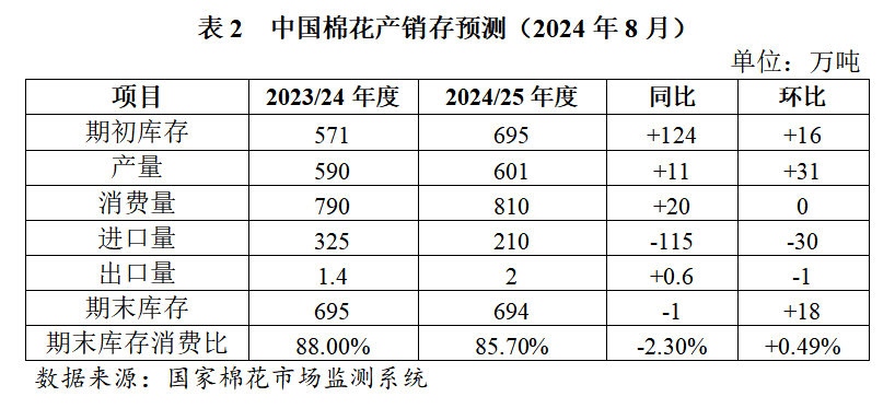 今年北半球棉花播種順利且長勢良好,市場對(duì)全球棉花增產(chǎn)預(yù)期較強(qiáng)。目前距棉花采摘還有1個(gè)月左右,這段時(shí)間的天氣變化及其對(duì)棉花產(chǎn)量的影響需密切關(guān)注。據(jù)美國農(nóng)業(yè)部8月預(yù)測,2024/25年度全球棉花產(chǎn)量2561萬噸,同比增加88萬噸;棉花消費(fèi)量2530萬噸,同比增加84萬噸。8月以來,美國密西西比州等地干旱情況有所加重,得克薩斯州西部水庫水位已低于正常水平,美棉產(chǎn)區(qū)干旱比例上升,可能導(dǎo)致棄收率提高。截至8月20日當(dāng)周,美棉產(chǎn)區(qū)約有30%受到干旱影響,較上周增加8個(gè)百分點(diǎn)。據(jù)美國農(nóng)業(yè)部調(diào)查,2024年美棉播種面積由7084萬畝下調(diào)至6781萬畝,收獲面積由5870萬畝下調(diào)至5239萬畝。據(jù)印度農(nóng)業(yè)部數(shù)據(jù),截至8月初,2024年印度棉播種面積1.62億畝,較去年同期下降約9%。8月美國農(nóng)業(yè)部供需預(yù)測調(diào)減美國、印度2024/25年度棉花產(chǎn)量,美棉產(chǎn)量預(yù)測由370萬噸下調(diào)至329萬噸,印度棉產(chǎn)量預(yù)測由544萬噸下調(diào)至533萬噸。此外巴基斯坦持續(xù)降雨天氣也使棉花生產(chǎn)和采摘受到不利影響,預(yù)計(jì)新棉上市進(jìn)度有所推遲。